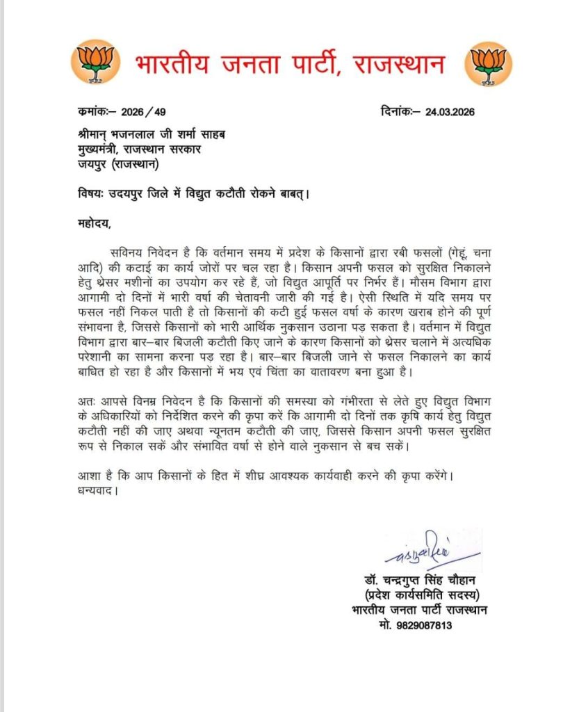 बीजेपी प्रदेश कार्यसमिति मेंबर डॉ. चन्द्रगुप्त सिंह चौहान ने उठाई किसानों की आवाज, उदयपुर में बिजली कटौती रोकने की मांग