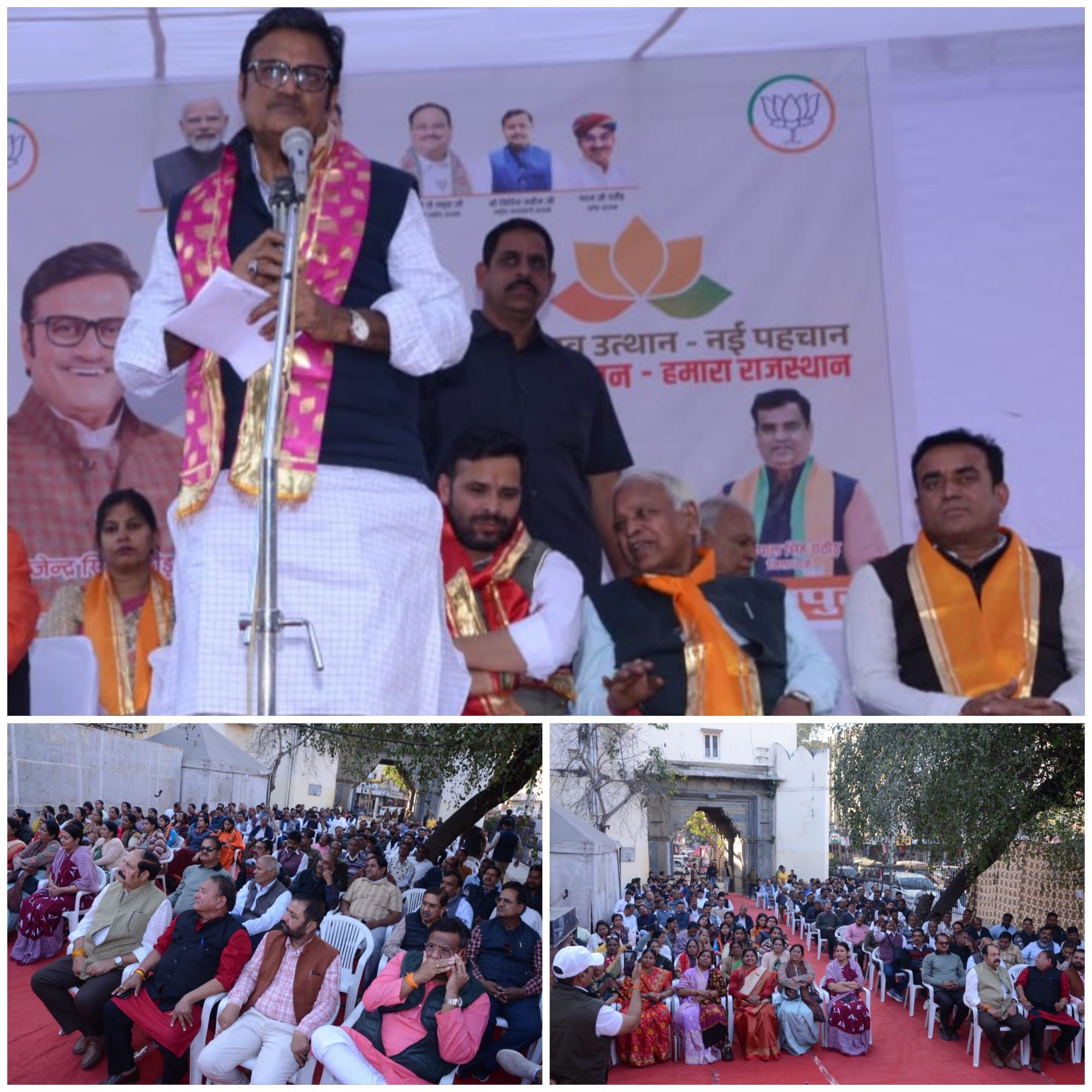 उदयपुर। राज्य सरकार के दो वर्ष पूर्ण होने के अवसर पर 15 दिवसीय कार्यक्रमों की श्रृंखला के तहत भामाशाह सर्कल, हाथीपोल पर एक विशाल सभा का आयोजन किया गया। कार्यक्रम के मुख्य अतिथि भारतीय जनता पार्टी के वरिष्ठ नेता एवं पूर्व नेता प्रतिपक्ष राजेंद्र सिंह राठौड़ रहे, जबकि संगठन प्रदेश महामंत्री मिथिलेश गौतम विशिष्ट अतिथि के रूप में उपस्थित थे। कार्यक्रम की अध्यक्षता उदयपुर शहर भाजपा जिलाध्यक्ष गजपाल सिंह राठौड़ ने की।सभा को संबोधित करते हुए पूर्व नेता प्रतिपक्ष राजेंद्र सिंह राठौड़ ने कहा कि “नव उत्थान, नई पहचान, बढ़ता राजस्थान” के संकल्प के साथ भजनलाल शर्मा के नेतृत्व में राज्य सरकार ने बीते दो वर्षों में सुशासन और जनकल्याण के ठोस कार्य किए हैं। उन्होंने कहा कि किसानों, युवाओं, महिलाओं, खिलाड़ियों और गरीब वर्ग के लिए सरकार की योजनाएं धरातल पर उतरी हैं।राठौड़ ने बताया कि पिछले दो वर्षों में 76.18 लाख किसानों को किसान सम्मान निधि के अंतर्गत 10,432 करोड़ रुपये से अधिक की राशि हस्तांतरित की गई। राइजिंग राजस्थान ग्लोबल इन्वेस्टमेंट समिट में 35 लाख करोड़ रुपये के एमओयू हुए, जिनमें से 8 लाख करोड़ रुपये के निवेश कार्य प्रारंभ हो चुके हैं। प्रधानमंत्री आवास योजना के तहत ग्रामीण क्षेत्रों में 1.36 लाख और शहरी क्षेत्रों में 68,738 आवास पूर्ण किए गए।उन्होंने बताया कि 17 जिलों में रामजल सेतु लिंक परियोजना के लिए 26 करोड़ रुपये के कार्यादेश जारी हुए, करीब 4 लाख पशुपालकों को किसान क्रेडिट कार्ड दिए गए तथा 5 लाख दुग्ध उत्पादकों को 1,172 करोड़ रुपये की सहायता प्रदान की गई। मुख्यमंत्री आयुष्मान आरोग्य योजना में 35 लाख रोगियों को 7,000 करोड़ रुपये से अधिक का कैशलेस उपचार मिला।सरकारी भर्तियों का उल्लेख करते हुए राठौड़ ने कहा कि दो वर्षों में 92 हजार पदों पर नियुक्तियां और 1.53 लाख पदों पर नई भर्तियां की गईं। प्रधानमंत्री फसल बीमा योजना में 6,207 करोड़ रुपये के क्लेम किसानों को वितरित किए गए तथा पीएम-कुसुम योजना के तहत 53 हजार सोलर पंप सेट लगाए गए।उन्होंने बताया कि प्रदेश में 16,430 किलोमीटर से अधिक नई सड़कों का निर्माण हुआ, जो औसतन 23 किलोमीटर प्रतिदिन है। खेलों को प्रोत्साहन देने के लिए 2,000 खिलाड़ियों को 40 करोड़ रुपये की सहायता तथा 698 स्टार्टअप्स को 22 करोड़ रुपये की सहायता दी गई। महिला सुरक्षा के लिए 500 पेट्रोलिंग यूनिट गठित की गईं, जिससे महिला अपराधों में 12 प्रतिशत की कमी आई।
