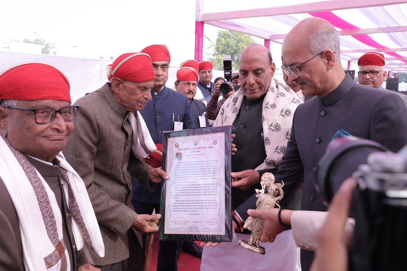 अवार्ड से सम्मानित 102 वर्षीय विभूति सहित अन्य सम्मानितजनों को सम्मानित करने के लिए रक्षा मंत्री स्वयं मंच से नीचे उतरकर उनके पास पहुंचे।