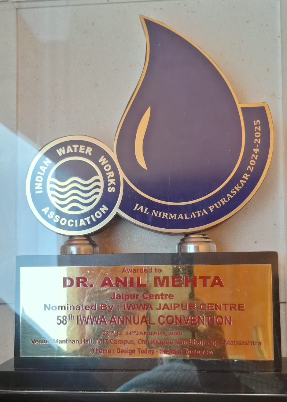 संभाजी नगर/उदयपुर/जयपुर। जल से जुड़े इंजीनियरों, वैज्ञानिकों के भारत के सबसे बड़े संगठन आइवा( इंडियन वॉटर वर्क्स एसोसिएशन) के 58 वे राष्ट्रीय जल सम्मेलन में विद्या भवन पॉलिटेक्निक के प्राचार्य, प्रसिद्ध जल विशेषज्ञ डॉ अनिल मेहता को जल निर्मलता पुरस्कार से सम्मानित किया गया है। यह पुरस्कार भारत के पूर्व जल संसाधन सचिव, स्टॉकहोम वॉटर प्राइज प्राप्त प्रसिद्ध जल अभियंता डॉ एम ए चितले द्वारा स्थापित किया गया है।