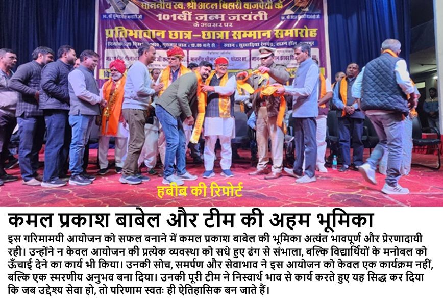 प्रधानमंत्री नरेंद्र मोदी का सपना है कि 2047 तक भारत एक आत्मनिर्भर, सशक्त और विश्व नेतृत्वकर्ता राष्ट्र बने — और यह सपना युवाओं के बिना अधूरा है।445 होनहारों का सम्मान, बेटियों का रहा वर्चस्वसमारोह में 10वीं व 12वीं बोर्ड में 90 प्रतिशत से अधिक अंक लाने वाले 445 विद्यार्थियों को सम्मानित किया गया।