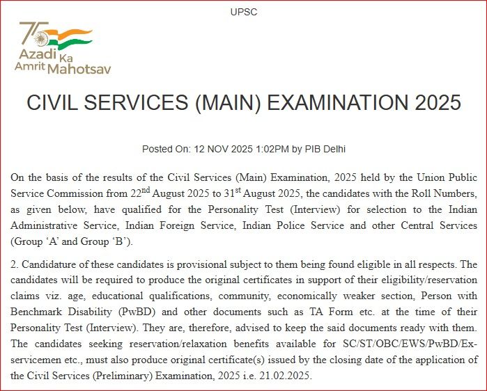 On the basis of the results of the Civil Services (Main) Examination, 2025 held by the Union Public Service Commission from 22nd August 2025 to 31st August 2025, the candidates with the Roll Numbers, as given below, have qualified for the Personality Test (Interview) for selection to the Indian Administrative Service, Indian Foreign Service, Indian Police Service and other Central Services (Group ‘A’ and Group ‘B’).