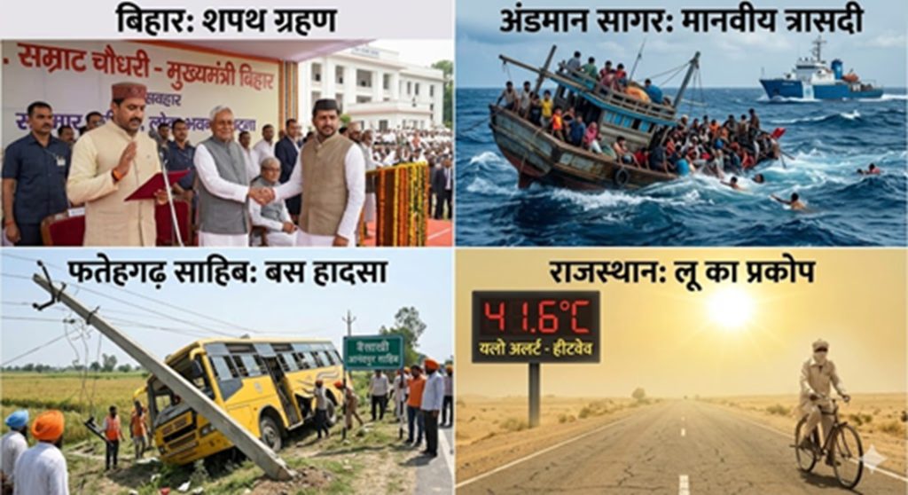 आज की बड़ी खबरों में बिहार की राजनीति में ऐतिहासिक सत्ता परिवर्तन, राजस्थान में भीषण गर्मी और लू का प्रकोप, तथा पंजाब में हुआ दर्दनाक सड़क हादसा प्रमुख हैं। वहीं, नोएडा में दो दिनों के बवाल के बाद औद्योगिक शांति लौटी है और हिंद महासागर में प्रवासियों से भरी नाव डूबने की दुखद खबर सामने आई है। शिक्षा और समाज सेवा के क्षेत्र में भी कई महत्वपूर्ण गतिविधियां दर्ज की गई हैं।