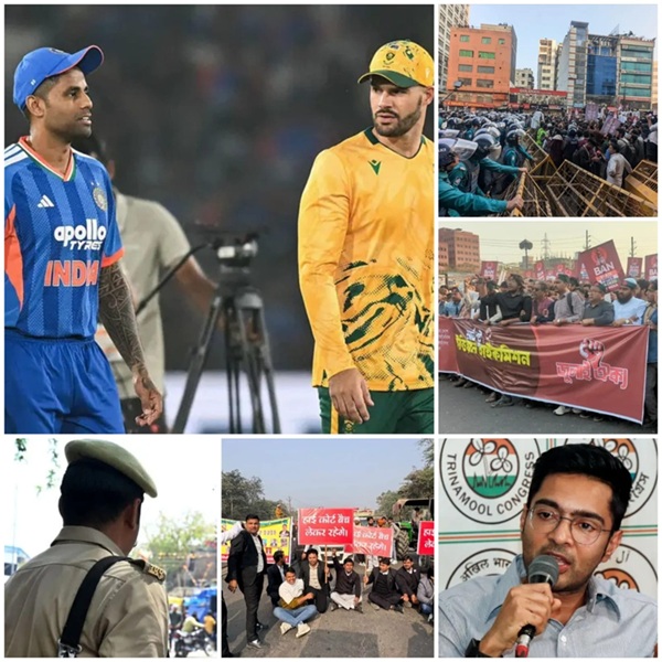 India-South Africa T20, Lucknow, fog delay, toss, India leading series, Bangladesh, Dhaka, Indian High Commission, protest, police barricade, Uttar Pradesh, Shamli, domestic violence, wife and daughters murder, burqa dispute, Western UP, lawyers protest, High Court bench demand, highway blockade, MGNREGA renaming, Abhishek Banerjee, central government, Bengal funds withheld, Manipur, Torbang buffer zone, shooting, ethnic tension, Kukijo Council, displaced families.