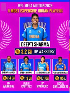 भारतीय ऑलराउंडर दीप्ति शर्मा इस मेगा ऑक्शन की सबसे महंगी खिलाड़ी रहीं।