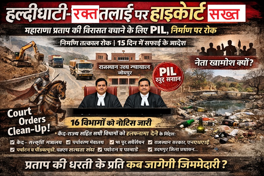 जोधपुर। महाराणा प्रताप की वीरता और स्वाभिमान के प्रतीक हल्दीघाटी दर्रा और रक्त तलाई की बदहाली पर राजस्थान उच्च न्यायालय ने कड़ा हस्तक्षेप करते हुए स्वतः संज्ञान लिया है। द टाइम्स ऑफ़ इंडिया में प्रकाशित रिपोर्ट “Highway to Haldighati: Where Chetak’s Leap Meets Truck’s Roar” के आधार पर अदालत ने इसे जनहित याचिका (PIL) के रूप में दर्ज कर किसी भी नए निर्माण व विस्तार कार्य पर तत्काल रोक, 15 दिन में विशेष सफ़ाई अभियान और अतिक्रमण–प्रदूषण पर सख़्त कार्रवाई के निर्देश दिए हैं। राजस्थान उच्च न्यायालय द्वारा स्वतः संज्ञान लेकर जनहित याचिका दर्ज किया जाना, दरअसल राजनीतिक और प्रशासनिक निष्क्रियता पर न्यायिक टिप्पणी के रूप में देखा जा रहा है।