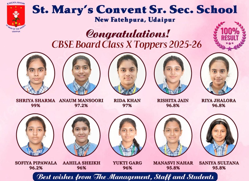 Keywords: St Mary’s School Udaipur Result, CBSE Class 10 Results 2026, Udaipur Topper Shriya Sharma, 100 Percent Result School India, Academic Excellence Udaipur, CBSE Board Toppers, Rajasthan Education News, School Achievement India